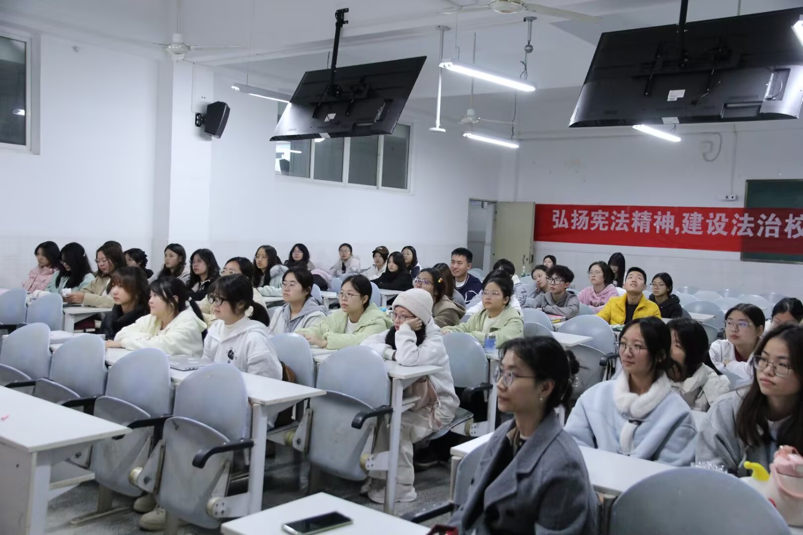 为大力弘扬宪法精神,维护宪法权威,推动法治知识走进校园、浸润人心,3044永利集团宪法宣讲团于11月24日晚19:40在勤学楼306教室开展“弘扬宪法精神,建设法治校园”主题宪法宣讲活动,本次活动由3044永利集团教师周敏指导,宪法宣讲团成员王坤、吴敏、滕霞、李元桀主讲,外国语公司2025级全体学子参加。 活动伊始,宣讲团成员以“理论+互动”形式开展宣讲:先通过视频梳理宪法发展历程,再解读公民权利义务核心规定,随后强调维护宪法权威的重要性;问答环节现场气氛热烈,同学们踊跃举手抢答,高效巩固宪法知识;最后周敏总结核心要点,勉励大家践行宪法精神。 本次宪法宣讲活动既帮助同学们筑牢宪法意识根基,将法治精神融入日常学习生活;也推动大家明晰权利义务边界,做到知法、懂法、守法、用法,进而成长为宪法的忠实崇尚者、自觉遵守者和坚定捍卫者。