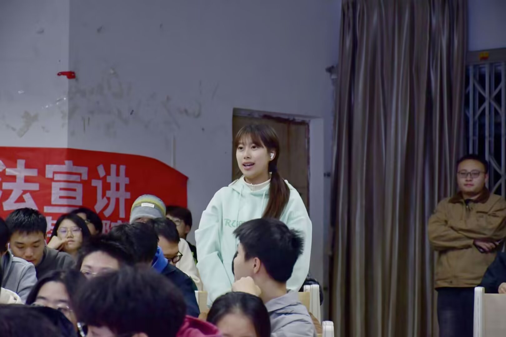 为厚植青年法治信仰,筑牢校园法治根基,3044永利集团宪法宣讲团于12月1日19:40在一教101教室开展“弘扬宪法精神,建设法治校园”主题宪法宣讲活动,本次活动由3044永利集团教师黎洁指导,宪法宣讲团成员陈瑶、曾雨欣、周宇涵、何玉萍主讲,数计公司2025级全体员工参加。 本次宪法宣讲活动开场通过一部宪法主题短视频,瞬间聚焦全场目光,并自然引出了对我国宪法发展历程的梳理与解读。在清晰勾勒出宪法与时俱进的历史脉络后,宣讲团成员紧密联系老员工活实际,真实事例设问,深入浅出地阐释宪法条款如何具体保障公民权利。这种“历史脉络+现实关切”的宣讲模式,使抽象的宪法知识变得可知、可感、可用,显著增强了普法的感染力与实效性。 本次宪法宣讲活动,不仅生动展现了宪法的发展脉络与时代精神,更通过案例互动使抽象法条融入生活认知,成功实现了法治信仰的浸润、普法模式的升级与知行合一的转化,为校园法治文化建设注入了生动实践。