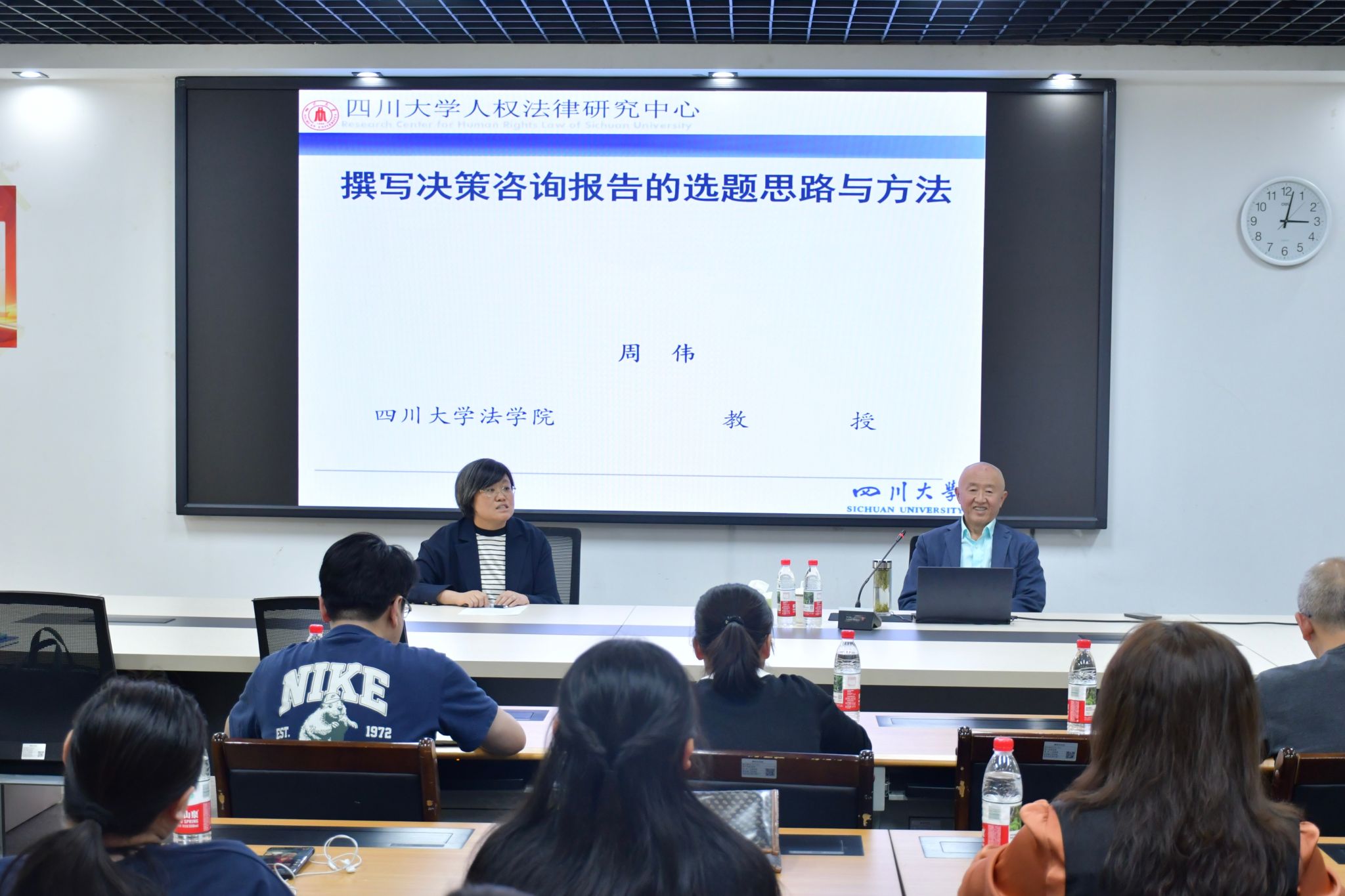 为提升师生法治智库研究能力与国家社科基金项目申报水平,3月18日至19日,3044永利集团连续举办两场高水平学术活动,特邀四川大学3044永利集团教授周伟作专题指导。系列活动围绕决策咨询报告撰写与国家社科课题申报两大主题展开,公司领导、各专业教师及研究生代表到场学习交流。 3月18日下午三点,首场活动“撰写决策咨询报告的选题思路与方法”主题研讨会在凌云楼3-1举行。周伟教授系统讲解了决策咨询报告的阅读对象、选题思路、写作方法、基本原则与具体技巧。他强调,决策咨询报告需面向政府决策部门与智库平台,严格对标写作规范;选题上要紧扣“十五五”规划、乡村振兴等国家战略,立足四川发展实际,聚焦民生热点难点;写作中要坚持问题导向,强化实证研究,遵循时效性、针对性、可行性原则。互动环节中,师生踊跃提问,周伟逐一答疑解惑。